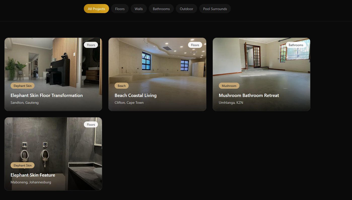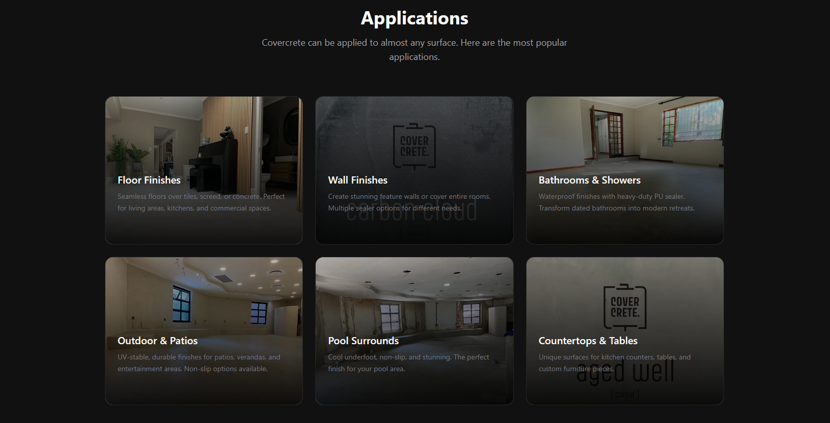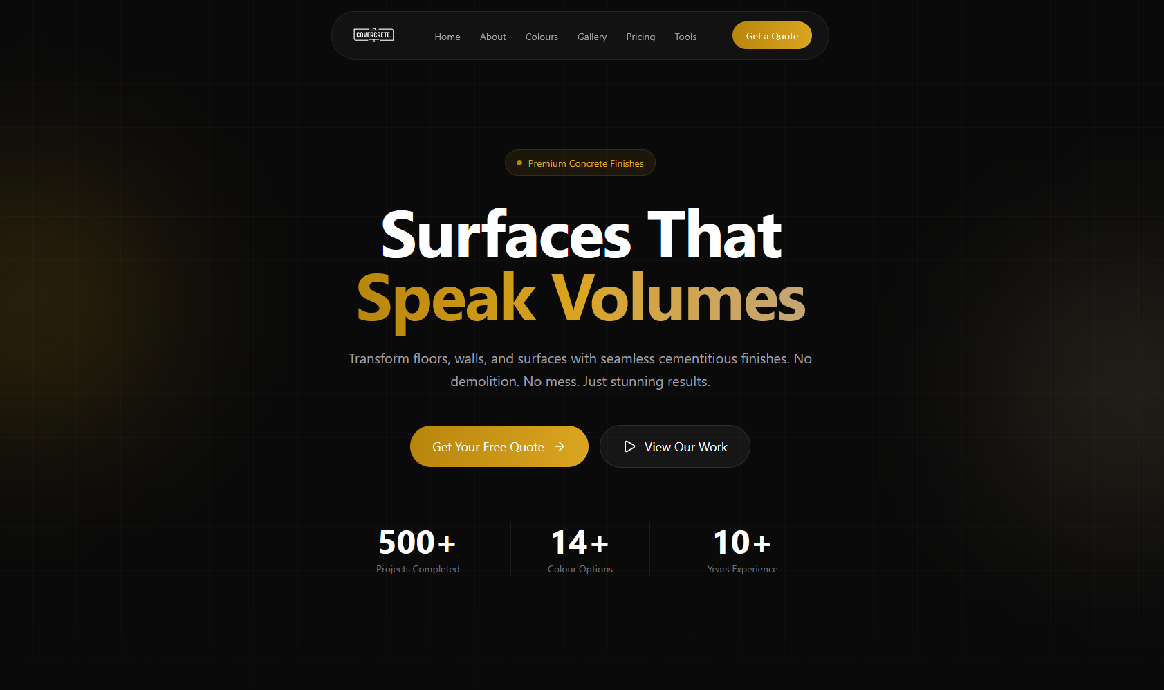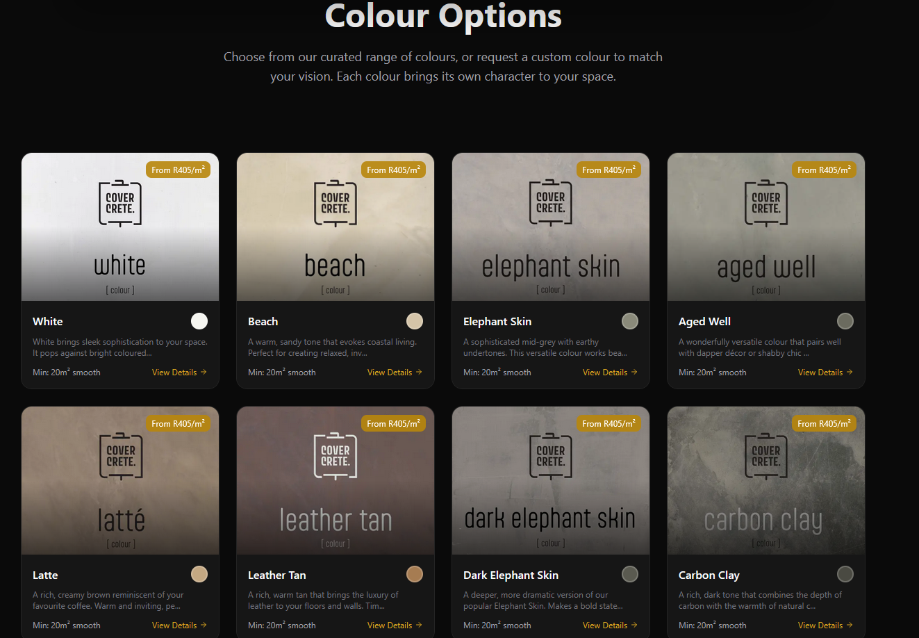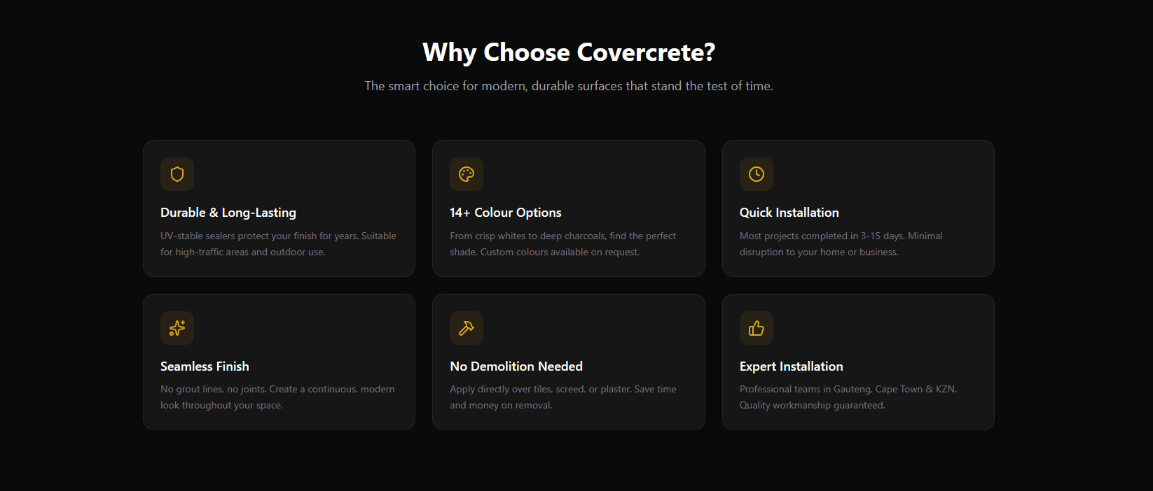 A premium business website for Covercrete, a South African decorative concrete finishes company serving Gauteng, Cape Town, and KZN. The site showcases their seamless cementitious screed finishes with a strong visual gallery, 14+ colour options, application types, and a clear process flow — all designed to drive free quote requests and establish trust with homeowners and contractors.